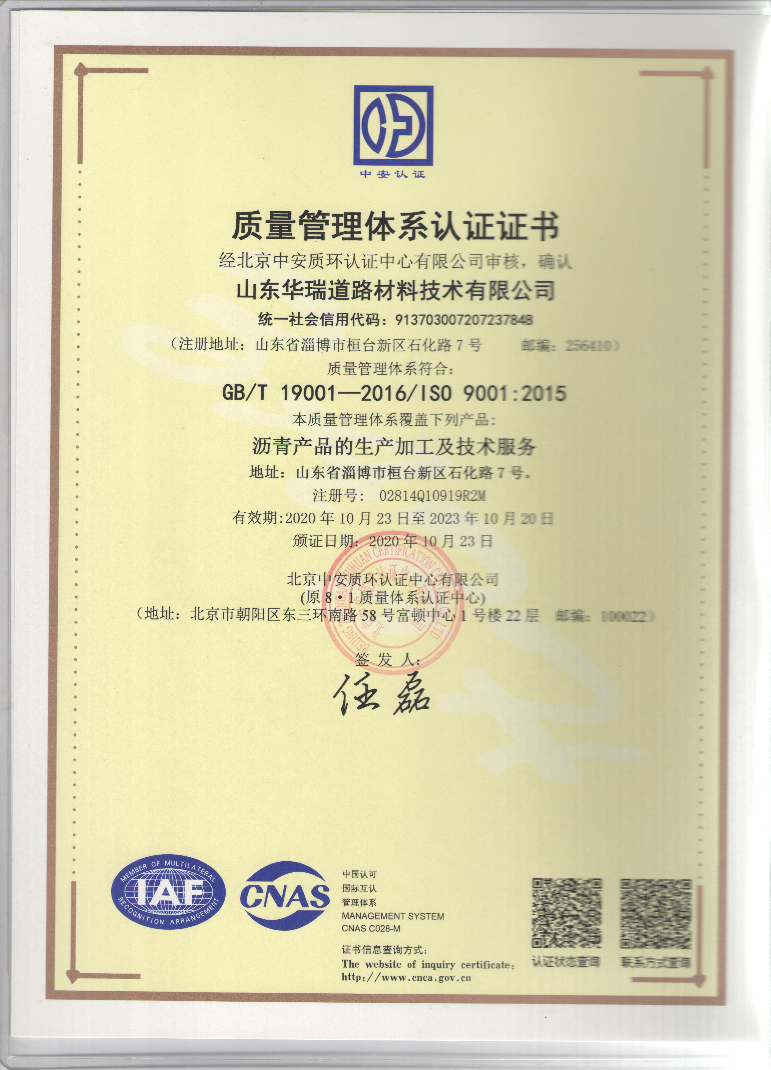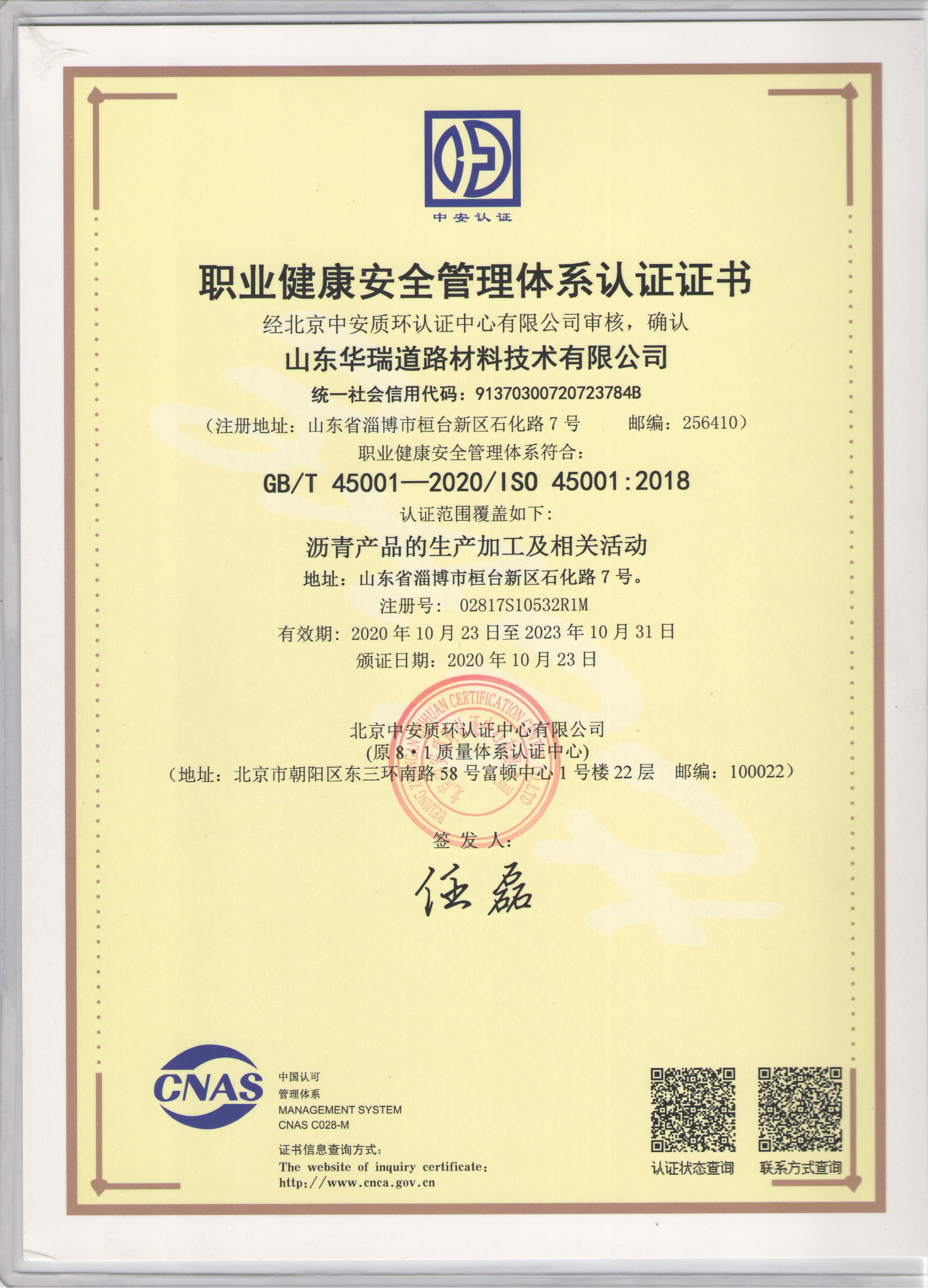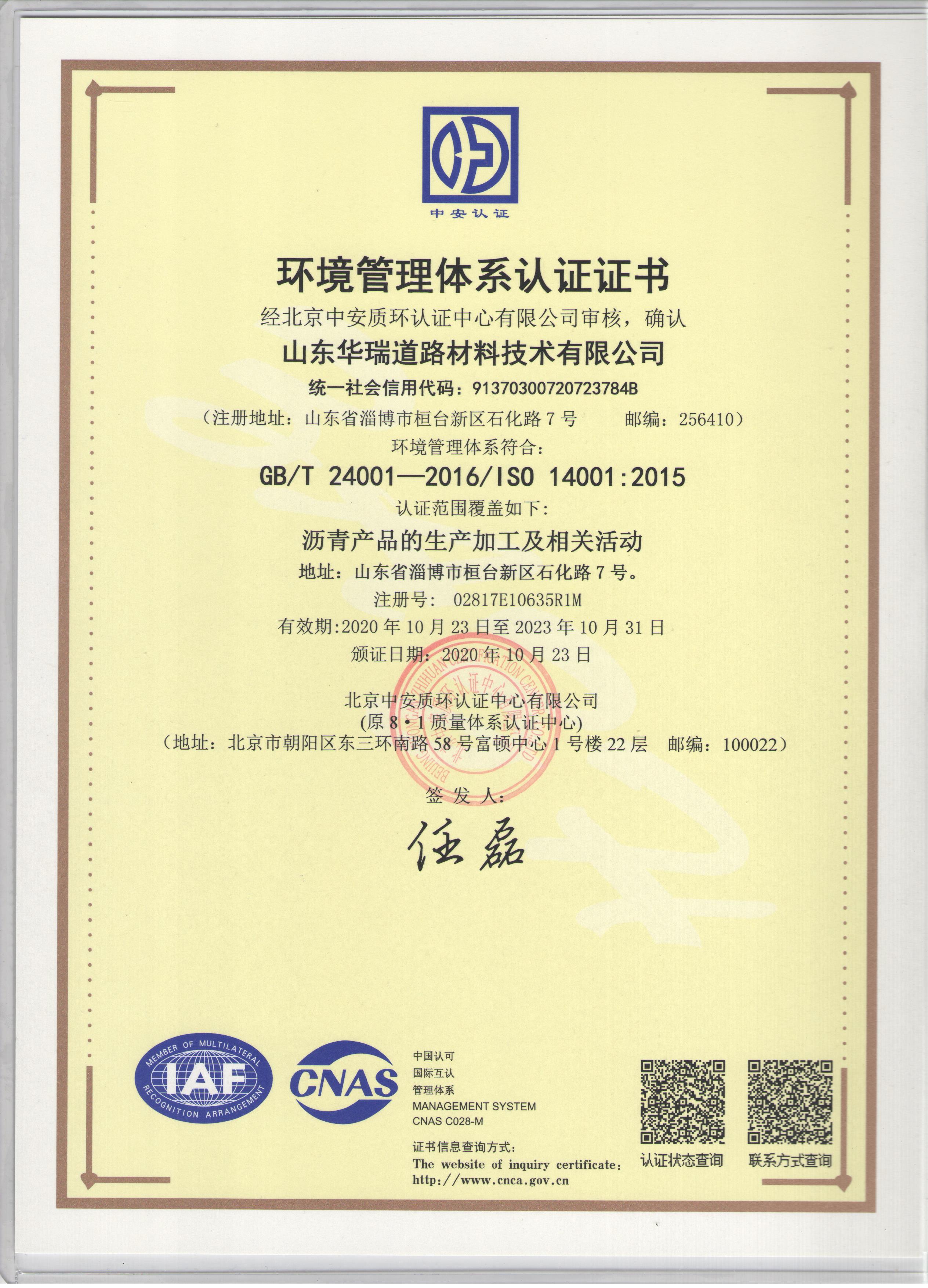 10月25日,公司收到了認(rèn)證中心核發(fā)的三標(biāo)體系認(rèn)證證書。