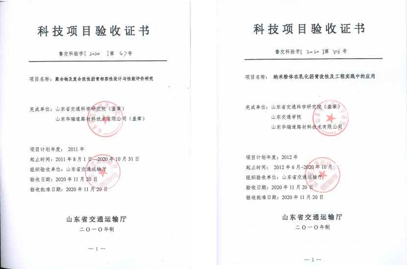 11月20日,華瑞公司與山東省交通科學(xué)研究院合作的《聚合物及復(fù)合改性瀝青相容性設(shè)計與性能評價研究》、《納米粉體在乳化瀝青改性及工程實踐中的應(yīng)用》兩項科研項目順利通過山東省交通運輸廳組織的項目驗收和成果評價。