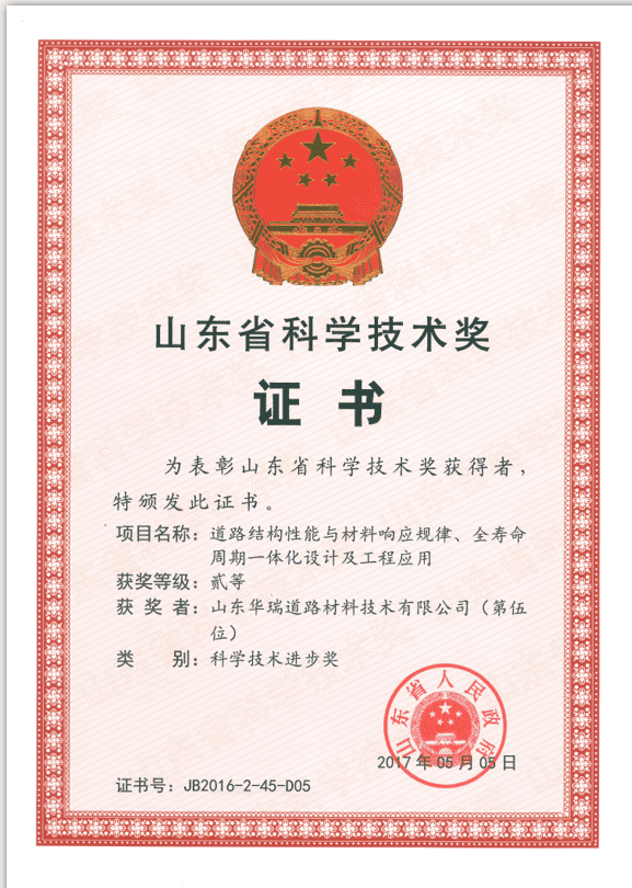 公司參與研究的《道路結(jié)構(gòu)性能與材料響應(yīng)規(guī)律、全壽命周期一體化設(shè)計(jì)及工程應(yīng)用》項(xiàng)目,獲得2016年度山東省科學(xué)技術(shù)進(jìn)步二等獎(jiǎng)。