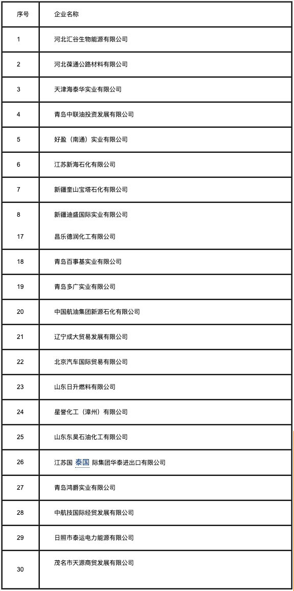根據(jù)商務(wù)部2012年第66號公告《公布2013年燃料油非國營貿(mào)易進口允許量申領(lǐng)程序、分配原則》(以下簡稱《公告》)的要求,中國五礦化工進出口商會對新申請2013年第二批燃料油非國營貿(mào)易進口企業(yè)報送的材料進行審核,商務(wù)部外貿(mào)司對審核情況進行了復(fù)審。截止2013年3月31日,共有41家企業(yè)報送了申請材料,其中符合《公告》要求的有30家企業(yè),現(xiàn)將材料齊全企業(yè)名單進行公示,公示期為2013年4月19-25日。公示期間,對公示名單有異議的,可向商務(wù)部(外貿(mào)司)提請公示復(fù)核。同時公布材料不齊全企業(yè)名單及所缺材料,公示期間,各相關(guān)企業(yè)仍可將補充材料報送至商務(wù)部外貿(mào)司,同時抄送中國五礦化工進出口商會。