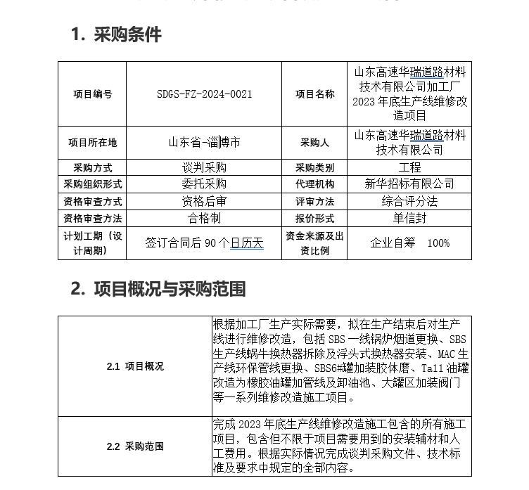 山東高速華瑞道路材料技術有限公司加工廠2023年底生產線維修改造項目談判采購公告