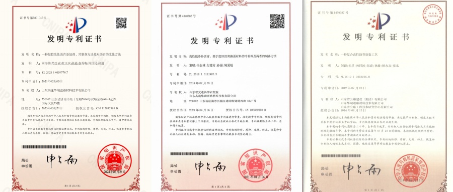 公司研制的MAC改性瀝青獲得了《一種凝膠改性瀝青添加劑、其制備方法及對瀝青的改性方法》和《高性能冷補瀝青、基于廢舊瀝青路面材料的冷補料及兩者的制備方法》等發(fā)明專(zhuān)利授權。MAC改性瀝青大碎石柔性基層新型路面結構獲得實(shí)用新型專(zhuān)利證書(shū)。